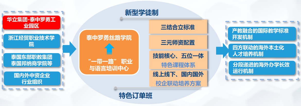 2019年,学校成功入选“‘中国—东盟’双百职校强强合作旗舰计划”建设单位,“一带一路”职业与语言培训中心项目荣获第二批“中国-东盟高职院校特色项目”,泰中罗勇丝路学院获批“浙江省首批‘一带一路’丝路学院建设计划”。2021年,“‘一带一路’植教入企:中企本土化班组长培养模式的探索与实践”融合浙江省教学成果奖二等奖。合作企业先后担任“泰国中国企业总商会罗勇商会理会”“泰国中国企业总商会橡胶行业协会”会长单位并荣获“2020中国走进东盟成功企业奖”。企业国际化运营水平得到了中泰两国领导人的认可与重视,共和国国务院、国家发改委、商务部、中国驻泰国大使、浙江省委、泰国各级政府等领导多次莅临指导。泰国副僧王颂德通猜与前副总理素贴称赞此项目“示范引领了两国职教合作,切实促进了民心相通、福祉相依”。